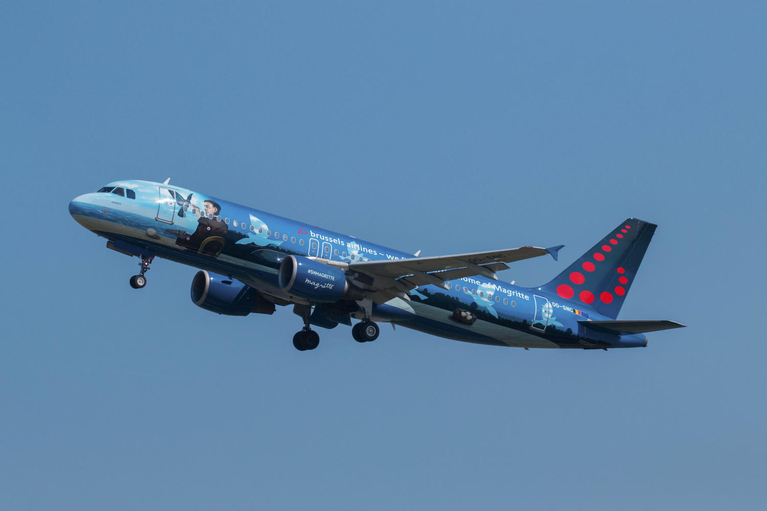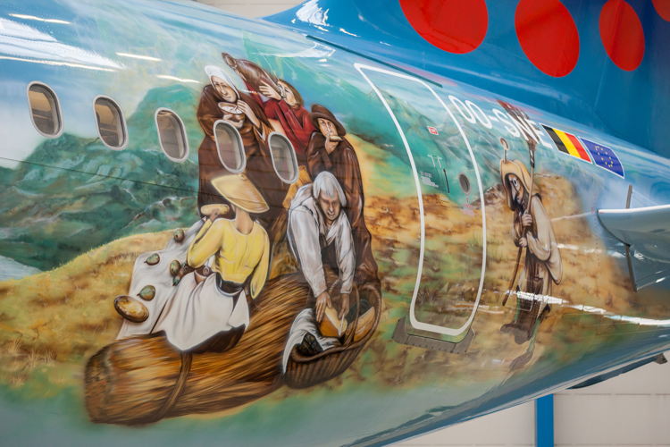 After Rackham in 2015, the airline welcomed two special liveries in 2016: Magritte and Trident, dedicated to the Red Devils, Belgium’s national soccer team. One year later Amare, a tribute to the music festival Tomorrowland, joined the fleet, followed by Aerosmurf and Bruegel in 2018 and 2019 respectively.