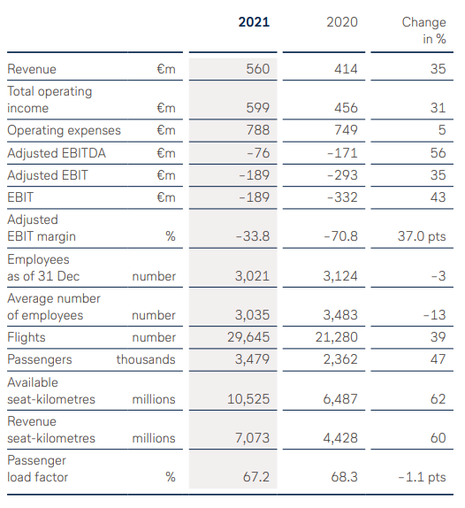 In het boekjaar 2021 bedroeg de aangepaste EBIT bij Brussels Airlines -189 miljoen euro (vorig jaar: -293 miljoen euro). De aangepaste EBIT-marge bedroeg -33,8% (vorig jaar: -70,8%). De EBIT bedroeg eveneens -189 miljoen euro (vorig jaar: -332 miljoen euro). De EBIT van het vorige jaar werd negatief beïnvloed door waardeverminderingen op de vloot voor een totaal bedrag van 33 miljoen euro.